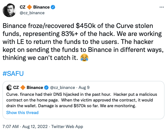 CZ salió a las redes hace escasos minutos, al escribir este artículo, para anunciar un gran logro por parte de Binance, la congelación y recuperación de 450.000 dólares de los fondos robados del hack de Curve Finance. El total reportado fue de 573.000 dólares en valoración fiat, representando así haber recuperado el 83% de los fondos usurpados del protocolo DeFi.