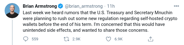En un tweet, el jefe de Coinbase ha respondido a la posibilidad de que Steve Mnuchin, el Secretario del Tesoro de Estados Unidos, planee nuevas regulaciones respecto a los monederos cripto sin custodia antes del final de su mandato.