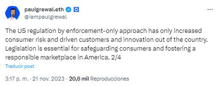 Y es que Paul Grewal aprovechó la ocasión para explicar la necesidad de un sistema regulatorio claro en Estados Unidos. Así lo hizo en un hilo en X donde dijo que los usuarios de Estados Unidos necesitan seguridad y claridad para poder entrar al mercado.