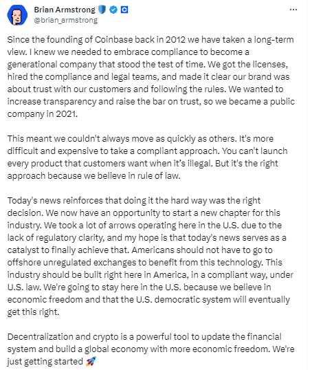 Por esto, Armstrong reafirmó que la visión de Coinbase será la de siempre apegarse a la ley y que no saldrán de Estados Unidos porque creen en su libertad y libre mercado.