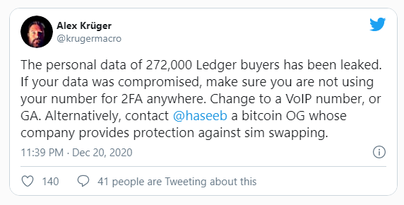 Según el usuario de Twitter Alex Krüger (@krugermacro), un economista y trader con más de 55.000 seguidores, cualquiera que haya comprado un monedero Ledger antes de julio de 2020 probablemente haya expuesto su información personal.