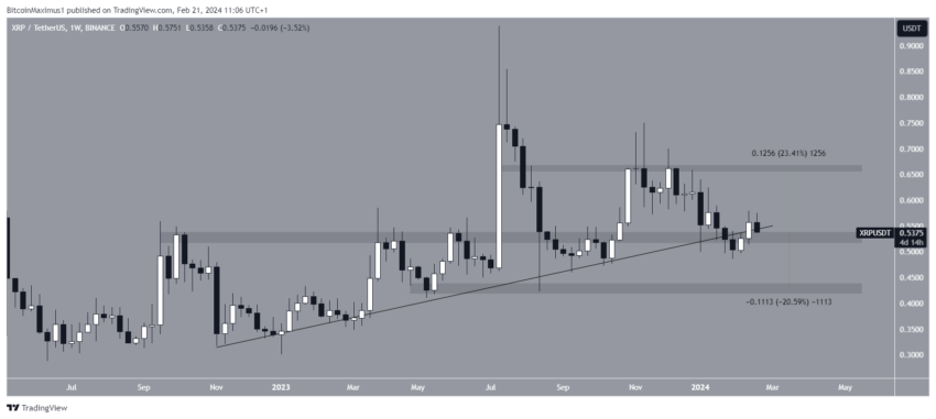 El gráfico de marco de tiempo semanal para XRP es alcista debido a la desviación y recuperación de dos niveles de soporte a largo plazo: una línea de tendencia de soporte ascendente y el área de soporte horizontal de 0,72 dólares.