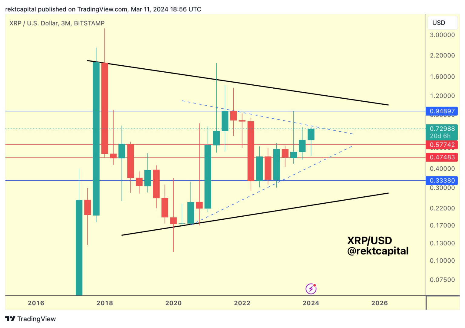 Esta reciente acción del precio de Ripple XRP se produce en medio de un rally más amplio del mercado. El mercado alcista ha sido alimentado por el optimismo y la especulación en torno a los principales hitos de la criptomoneda, como los potenciales Exchange-Traded Funds (ETF) y el tan esperado halving de Bitcoin.