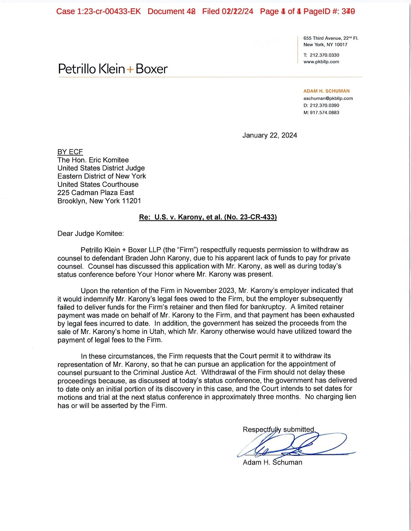 Por otra parte, y acuerdo a la información suministrada por Petrillo Klein & Boxer, abogados de Karony, estos abandonarían la defensa del ejecutivo. Esto se debería a la aparente la falta de fondos por parte del CEO de SafeMoon.