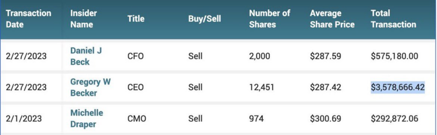 SponsoredOtra presentación ante la SEC mostró que Becker había vendido 1,1 millones de dólares en acciones en enero para cubrir la obligación tributaria. Según las presentaciones, el CEO vendió principalmente sus acciones entre 285 y 302 dólares.