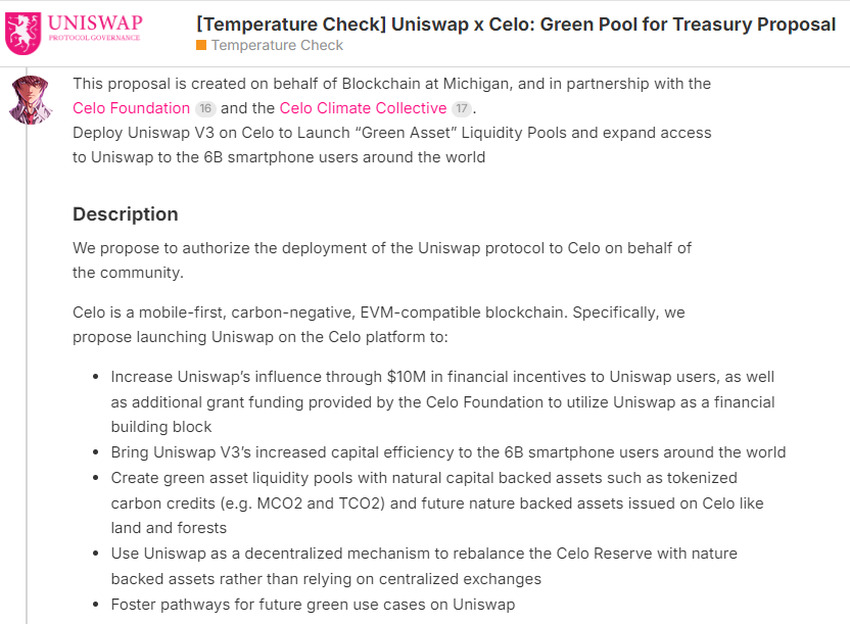 En 2022, la Fundación Celo, que supervisa la blockchain Celo (una plataforma móvil y sin emisiones de carbono para la Web 3.0 y el impacto medioambiental) se puso en contacto con Uniswap para promover casos de uso ecológicos. Como parte de esta iniciativa, la Fundación Celo buscó reestructurar su tesorería utilizando tokens respaldados por activos ecológicos.