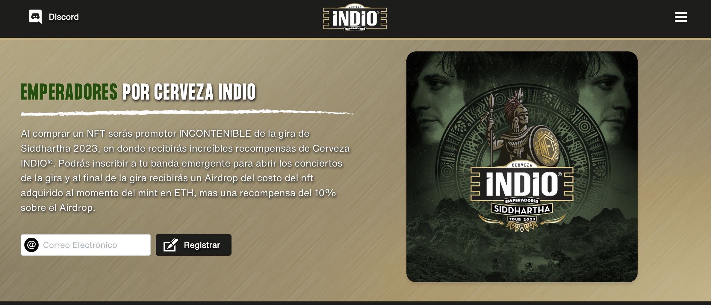 Al comprar un NFT, el usuario será promotor INCONTENIBLE de la gira de Siddhartha 2023, en donde recibirá increíbles recompensas de Cerveza INDIO. Podrá inscribir a su banda emergente para abrir los conciertos de la gira y al final de la gira recibirás un Airdrop del costo del NFT adquirido al momento del mint en ETH, mas una recompensa del 10% sobre el Airdrop.