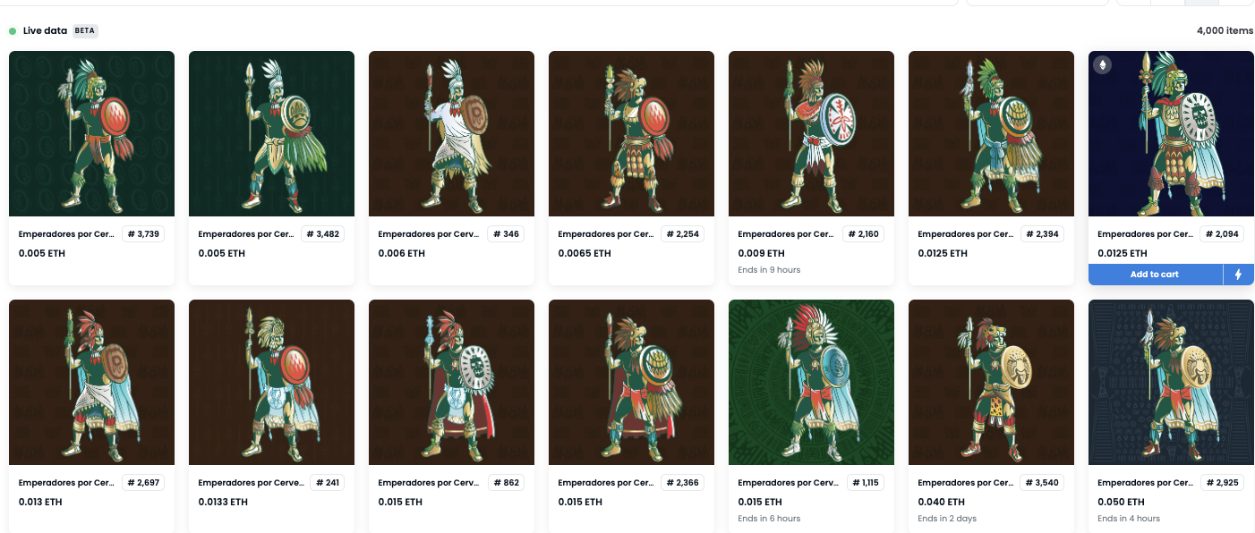 Hasta el momento, “Emperadores” de Cerveza indio tiene 1,336 holders y el volumen total de trading ha sido por 0,5041 ETH, y su mayor actividad se registró a principios de diciembre pasado y a principios de 2023. La puja por algunos de sus NFT ha oscilado entre 8 y 48 dólares.