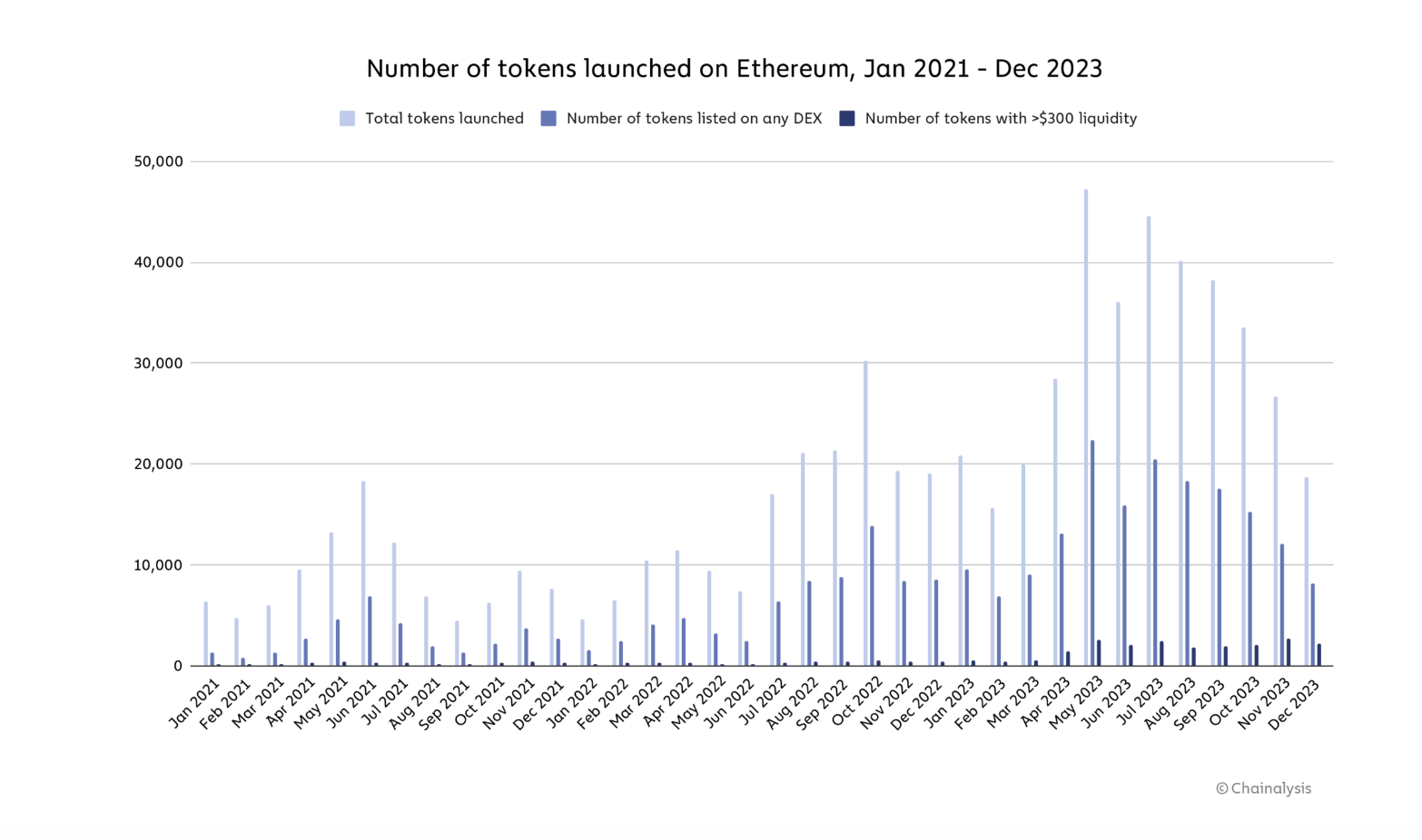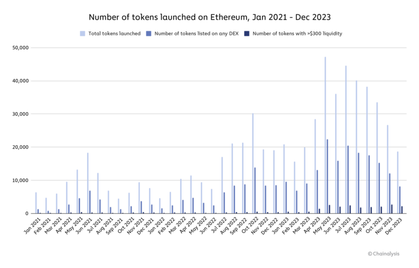 Entre enero y diciembre de 2023, se lanzaron poco más de 370,000 tokens en Ethereum , de los cuales aproximadamente 168,600 estaban disponibles para negociar en al menos un exchange descentralizado (DEX).
