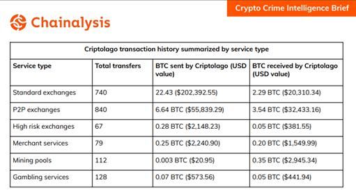 Las transacciones con exchanges regulados y conocidos por Chainalysis son menores, se registran unas 740 transacciones, sin embargo, si se registra un mayor valor en las mismas. Un total de 22,43 Bitcoins fueron enviados desde Criptolago, mientras que recibieron 2,29.