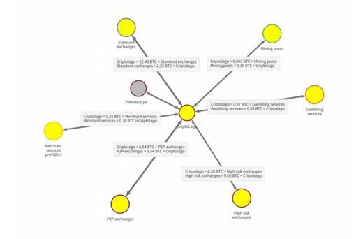 En la propia investigación la empresa forense destaca que muchas de estas transacciones terminan en wallets privadas y servicios desconocidos por los investigadores, sin embargo, 1967 transacciones se realizaron entre Criptolago y empresas reconocidas por Chainalysis. En el gráfico abajo mostrado se puede ver los movimientos que registró la investigación.