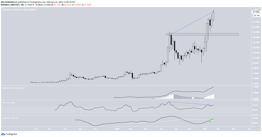 El gráfico semanal muestra que LINK ha aumentado desde que rompió y volvió a probar la zona de resistencia del máximo histórico anterior en 19 dólares.