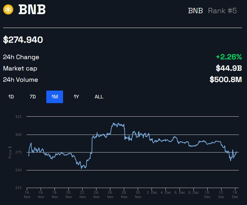 BNB estaba operando en 275 dólares en el momento de la publicación. La criptomoneda cayó a 262 dólares durante el momento de mayor temor, pero ha recuperado la mayor parte de esas pérdidas.