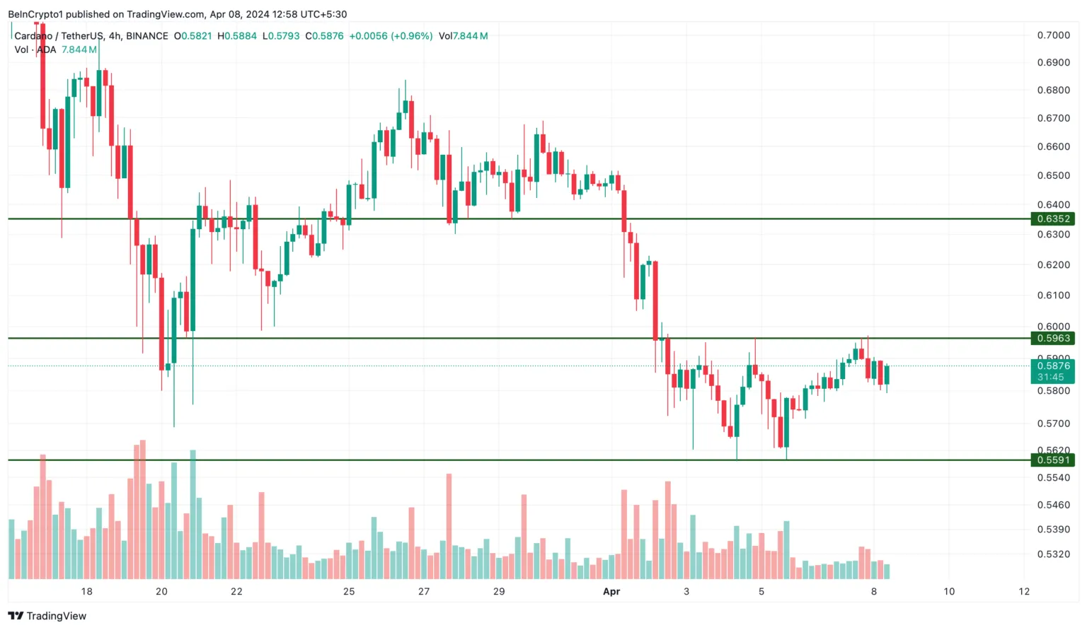 La perspectiva financiera es igualmente convincente, especialmente en lo que respecta a los movimientos de precios de ADA. Tras un descenso del 30% desde mediados de marzo, ADA se ha estabilizado, oscilando entre 0,5963 y 0,5591 dólares.