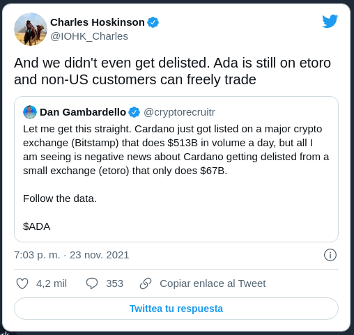 A través de un tweet, el matemático resaltó que ADA permanece listada en eToro y “y los clientes no estadounidenses pueden comerciar libremente”