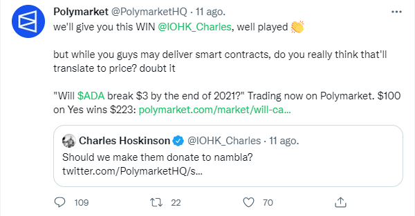 “Te otorgamos este premio, @IOHK_Charles, bien jugado. Pero mientras entregas smart contracts, ¿Realmente crees que eso afectará el precio? ¿Dudamos que $ADA supere la marca de $3 para finales de 2021?”.