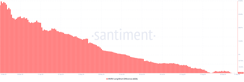 Mientras tanto, los datos on-chain de Santiment muestran que el indicador MVRV Long/Short Difference se sitúa en -19,93%. Esta lectura negativa implica que los holders de Cardano a corto plazo tienen más ganancias no realizados que sus homólogos a largo plazo.