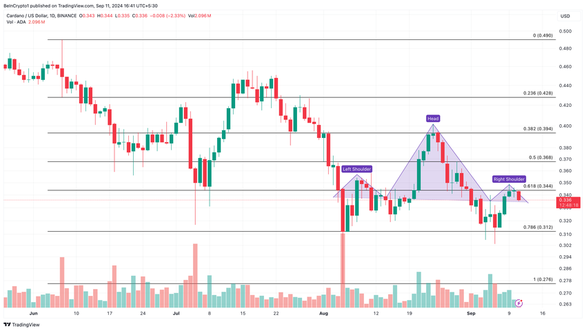 Una mirada al gráfico diario ADA/USD muestra que el token ha formado un patrón de cabeza y hombros, un patrón técnico que significa una tendencia alcista a bajista.