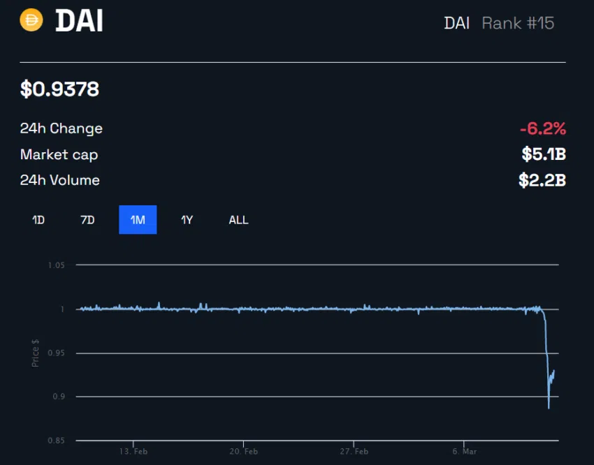SponsoredPara el contexto, DJED, la stablecoin sobrecolateralizada basada en Cardano, ha mantenido su paridad y se cotiza a una prima de 1,01 dólares frente a las dificultades del USDC. Mientras tanto, otras stablecoins algorítmicas expuestas al USDC, como FRAX y DAI, han perdido sus clavijas. DAI ha caído 6% en las últimas 24 horas a 0,93 dólares y FRAX ha bajado 10% a 0,90 dólares.