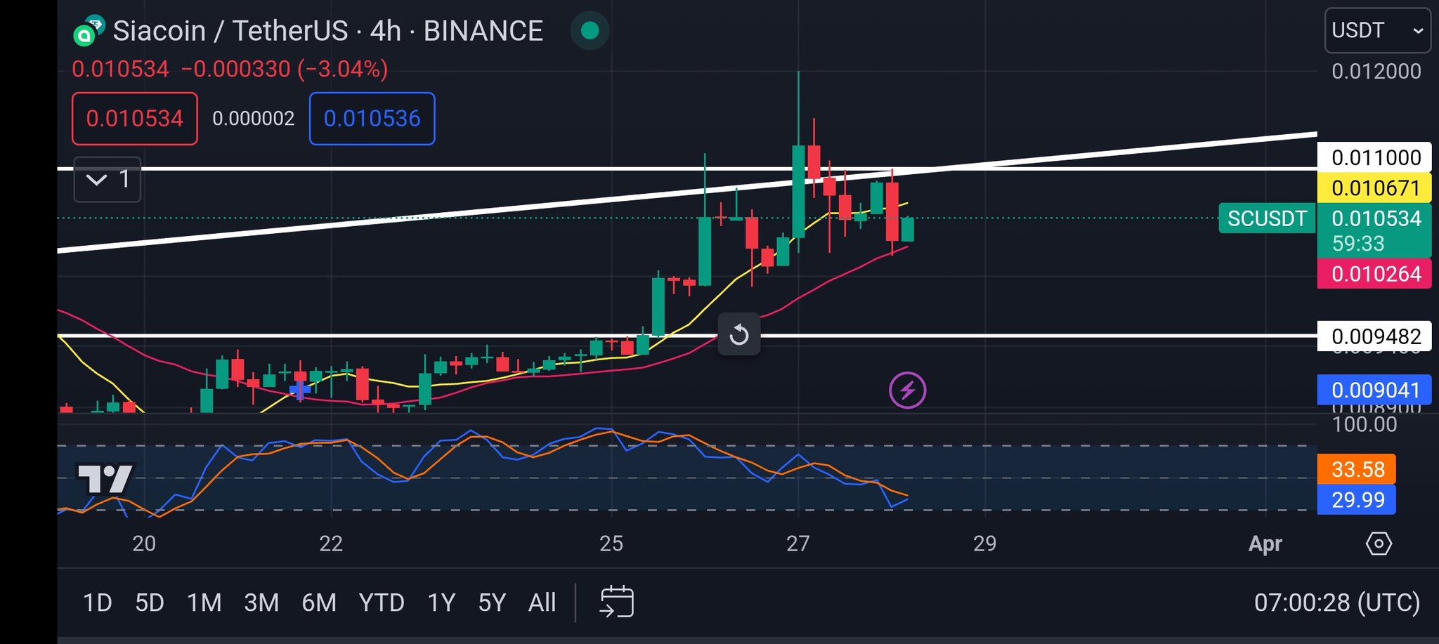 “En el gráfico de 1 hora, Siacoin rompió el triángulo y fue rechazado por la resistencia de la cuña ascendente en $0.011 y ahora se está recuperando desde $0.0101. En el [gráfico de ]4H, la MA se mantiene como soporte y está rebotando en él y a punto de subir en el estocástico”.