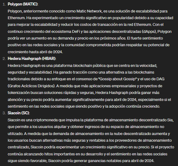 En este sentido, ChatGPT menciona tres criptomonedas que podrían tener el potencial de generar ganancias significativas en abril de 2024, considerando su precio actual y el sentimiento en las redes sociales.