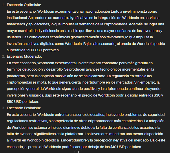ChatGPT comparte tres escenarios para el precio de WLD en 2024. En el escenario optimista, el token podría superar los 100 dólares. En el escenario moderado, WLD podría ubicarse entre los 30 dólares y 50 dólares. Por último, en el escenario pesimista, WLD se ubicaría por debajo de los 10 dólares.