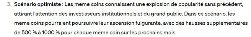 Dado el hype reinante, el chatbot estima que estas criptomonedas meme podrían ganar entre un 200% y un 300% en varios meses.