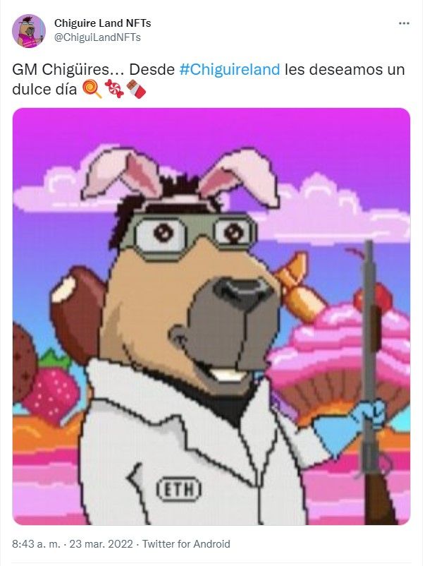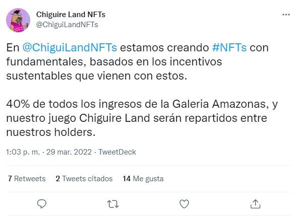 ChigüireLand sacará una serie de NFT al mercado para que cualquiera que esté interesado pueda comprarlos. Estos funcionarán como una especie de acciones y todos los que los tengan recibirán parte de las ganancias que genere el proyecto final. Si revisamos las redes del proyecto nos encontramos con que hay varias obras que están presentando al público y que reciben una buena acogida.