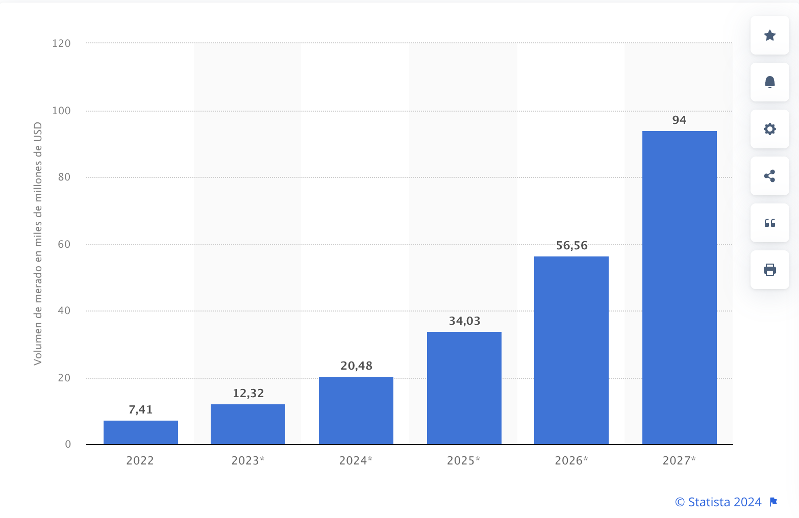 Datos de Statista sugieren que el valor de mercado de blockchain a nivel mundial en 2022 era de 7,400 millones de dólares. No obstante, para 2027 será de 94,000 millones de dólares. Es decir, en solo cinco años, el mercado de blockchain crecerá 12 veces.