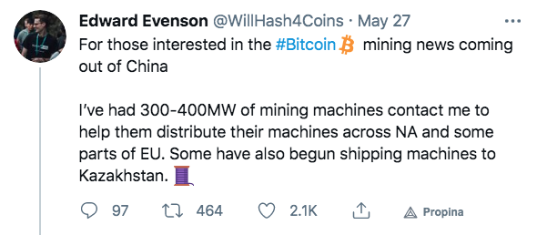 Al parecer, un número significativo de mineros están explorando oportunidades para ubicarse en otros lugares. Esto podría acelerar la reciente tendencia de que el hash power de Bitcoin se aleje de China, que históricamente ha dominado la industria minera.