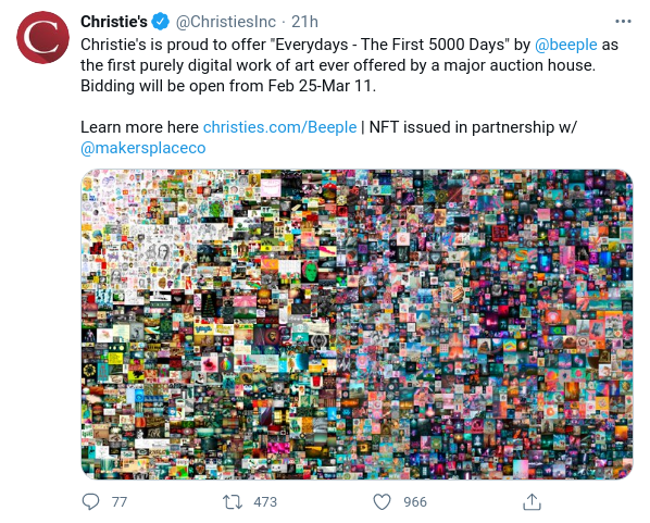 SponsoredEsta mañana en su cuenta oficial de Twitter hacían público el anuncio conforme se iba a realizar su primera subasta de cripto arte. La obra escogida es “Everydays – The First 5000 Days” del artista conocido como Beeple.