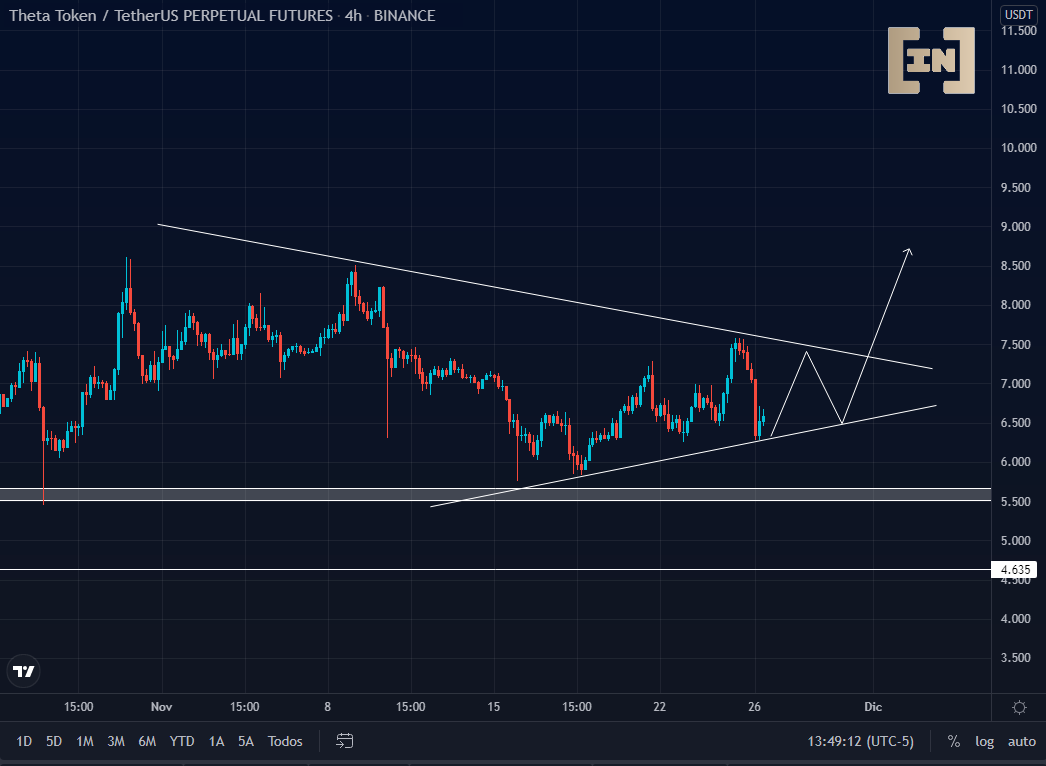 El precio de THETA ha formado una triangulación alcista, mientras se logre mantener por encima de los 6 dólares y el soporte principal ubicado en los 5.5 dólares, sugiere tanto la continuidad como la estabilización de la cotización previa a una buena ruptura al alza con objetivo alcanzar los 9 dólares.