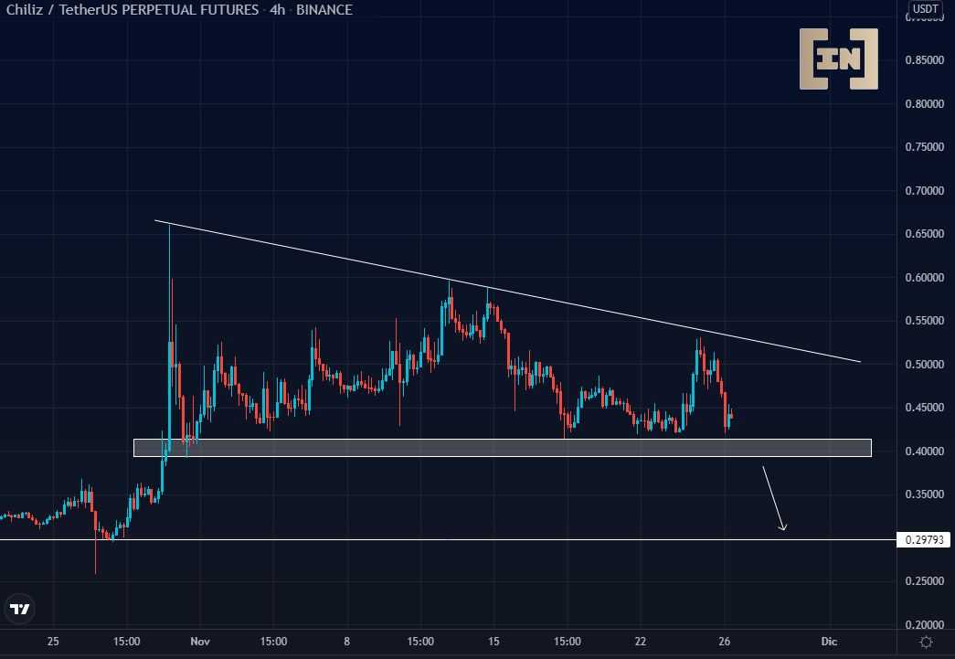 Como se puede apreciar en la gráfica, CHZ se encuentra dentro de la formación chartista triángulo descendente. Las últimas velas de rango largo con alto volumen, no se consideran velas de acumulación sino, por el contrario, velas de agotamiento y de distribución.