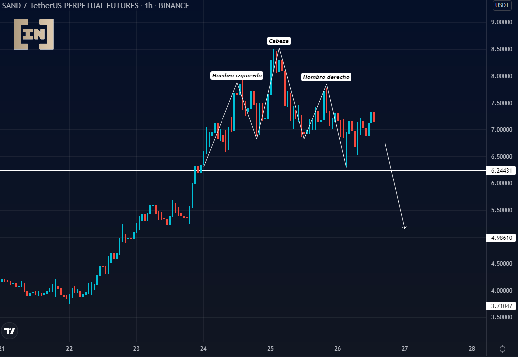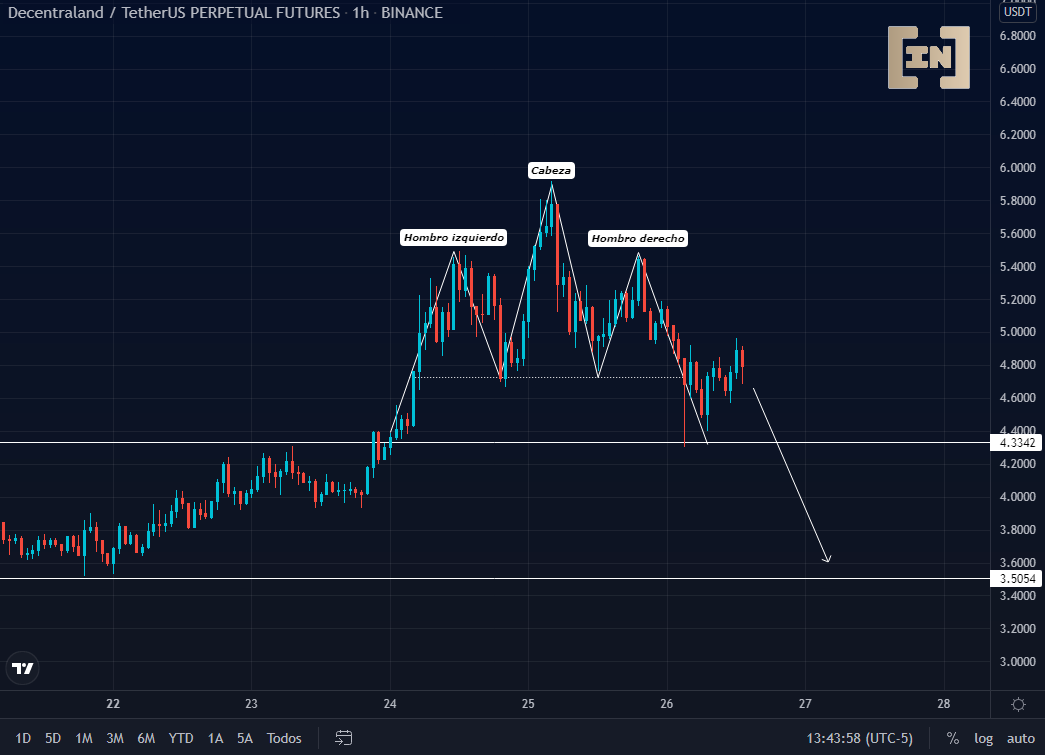 Al igual que MANA, se puede apreciar en la figura chartista (HCH) en temporalidad de 1 hora, podemos deducir la imposibilidad de batir un nuevo máximo y por consiguiente una posible ruptura del soporte de los 6.2 dólares, que lo lleve a buscar precios más aceptables para los compradores, lo que podría ser el siguiente soporte ubicado en los 5 dólares.