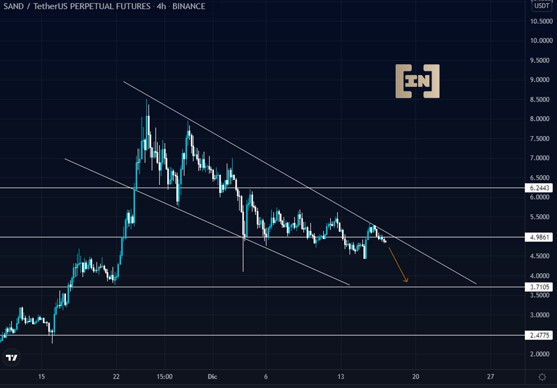 El precio de The Sandbox cotiza por encima de los 4.5 dólares, pero su tendencia descendente lo proyecta a los 3.7 dólares.