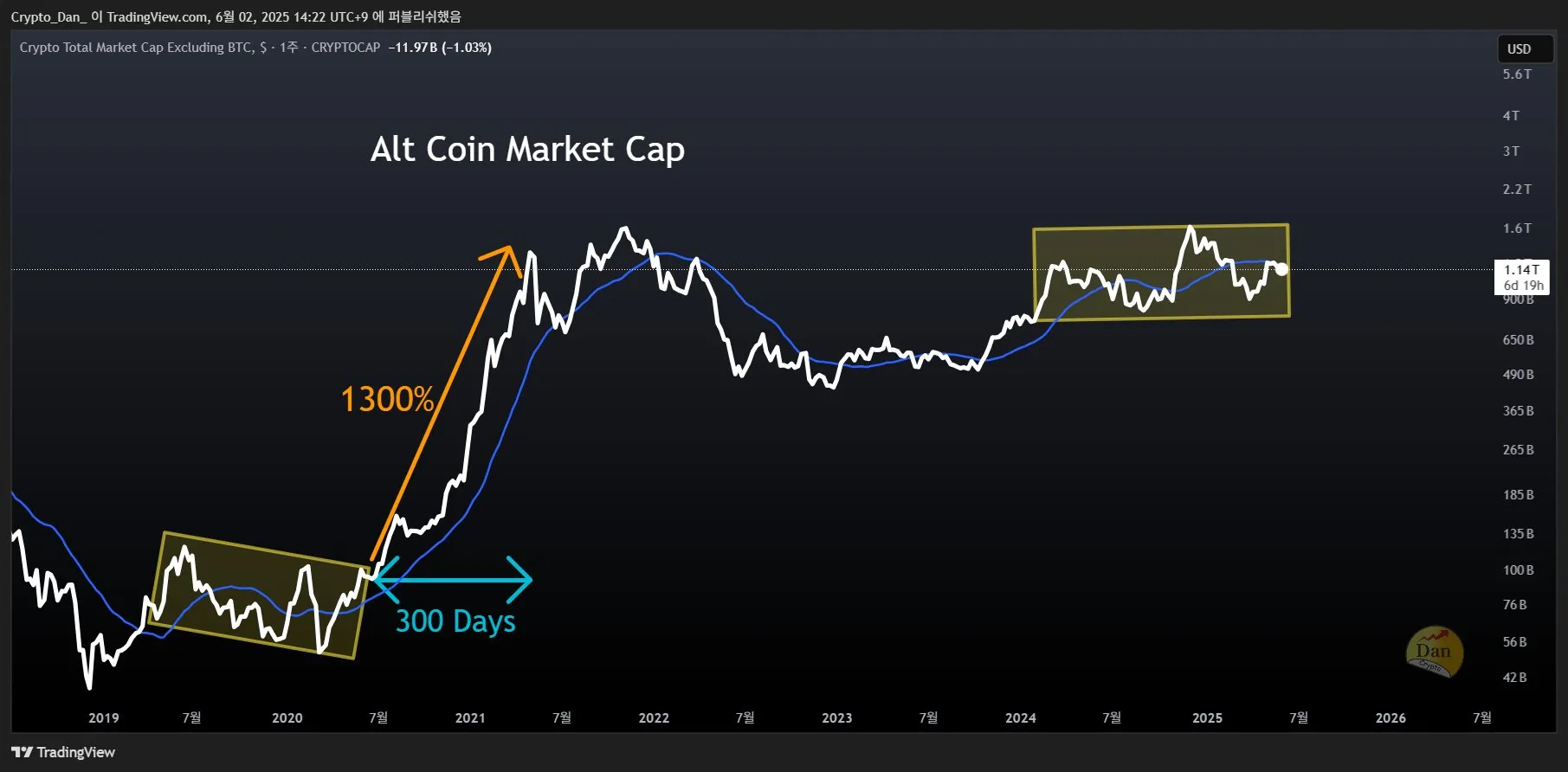“Déjenme recordarles: en el ciclo anterior (2020 a 2021), durante una altseason de 300 días, la capitalización total del mercado de altcoins aumentó alrededor de 1300%. Si esta vez, debido a los ETF spot y al capital institucional, el ciclo se extiende más de lo habitual, entonces también debemos considerar que puede no terminar en 2025, sino que podría durar aún más,” dijo Dan.