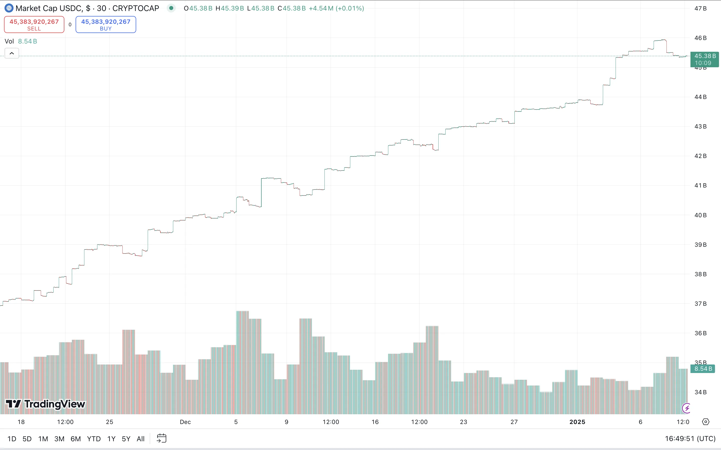 La capitalización de mercado de USDC ha aumentado gradualmente desde la reelección de Trump. El mercado alcista en curso impulsó la demanda de stablecoins en todo el mercado y las empresas estadounidenses se beneficiaron en gran medida del optimismo regulatorio. En particular, el retroceso de Tether en Europa debido a MiCA ha impulsado la demanda de USDC en el mercado global.