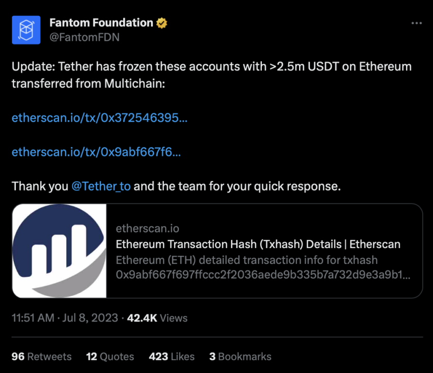 SponsoredLa Fundación Fantom informó que Tether congeló dos direcciones con un saldo de más de 2.5 millones de dólares. Etherscan las marcó como “Direcciones multi-chain sospechosas”.