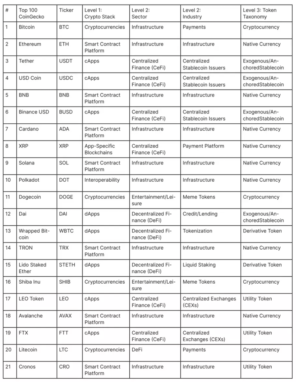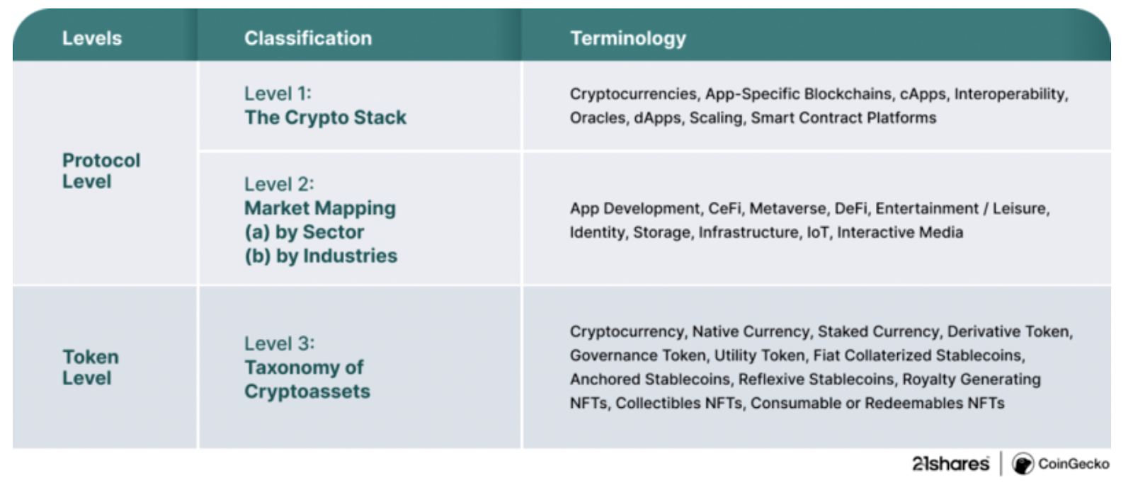 Pero como la industria cripto es relativamente nueva, un principiante se confunde con varias terminologías y jergas. Palabras como descentralización, solución de escalado de capa 1, metaverso y NFT pueden abrumar a un principiante. Por lo tanto, CoinGecko y 21Shares colaboraron para preparar el informe GCCS para simplificar la industria al categorizar mejor los criptoactivos.
