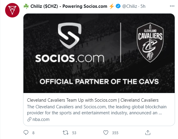 El anuncio establece que Socios.com, una plataforma propiedad de Chiliz, tendrá su logotipo en las camisetas de práctica de los Cavs para la temporada 2021-22 de la NBA.