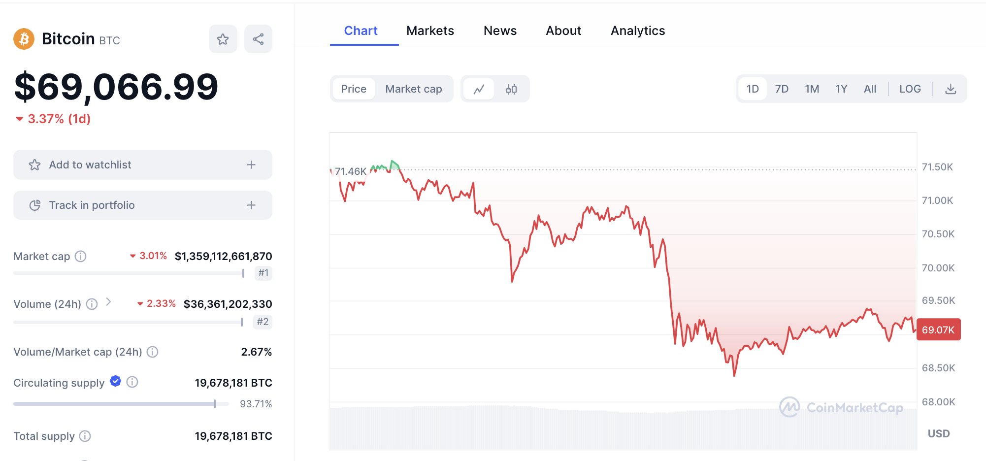 El precio actual de Bitcoin al 09 de abril es de 69,154 dólares, opera con una pérdida de 3,58% en las últimas 24 horas. No obstante, en la última semana, BTC ha ganado 5,59%, aunque en el último mes, la criptomoneda solo ha ganado 1,01%, ya que su máximo precio ha sido de 73,573 dólares, de acuerdo con CoinMarketCap.