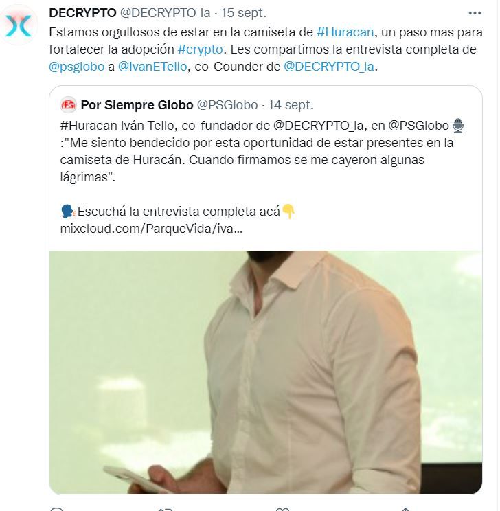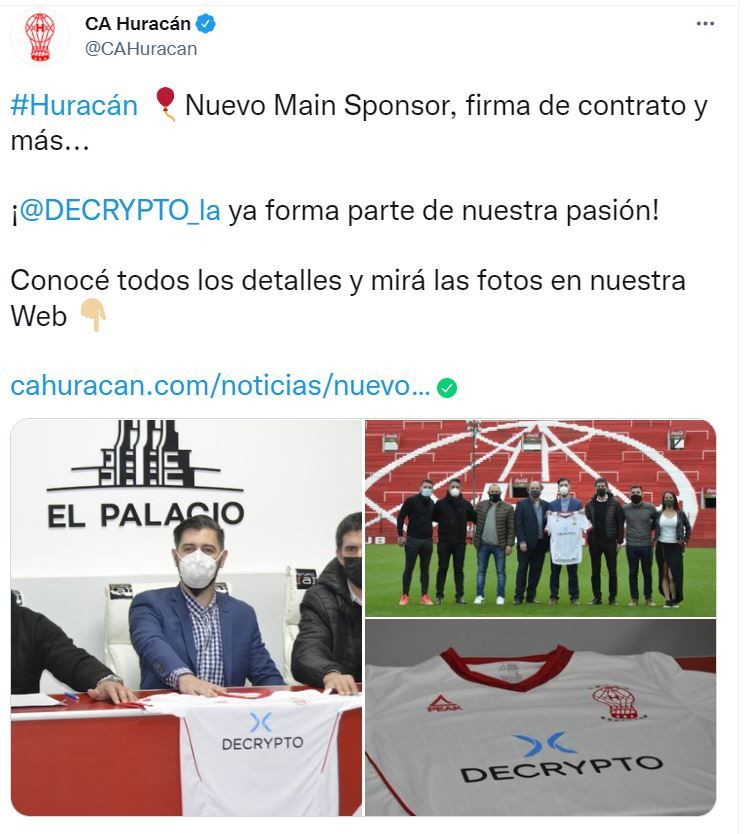 La plataforma de compra y venta de criptomonedas es la primera en firmar con un club de primera división en Argentina, donde el logo de Decrypto también aparecerá en la cartelera del campo de juego, así como en la infraestructura del estadio donde juega el Huracán.
