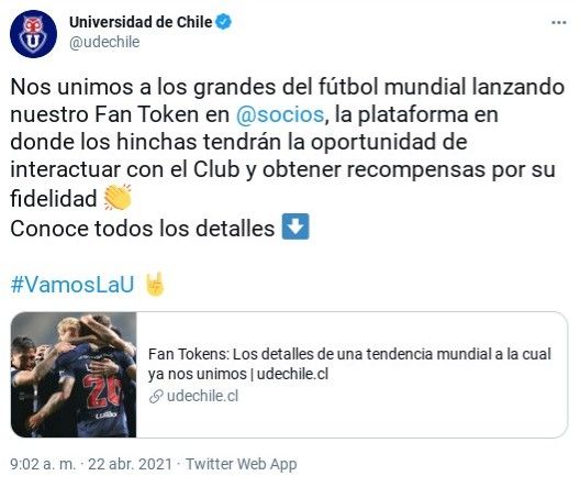 De acuerdo a la publicación ofrecida a través de la página oficial del Club Universidad de Chile, el 28 de abril se lanzará el fan token ($UCH) a través de la plataforma socios.com.