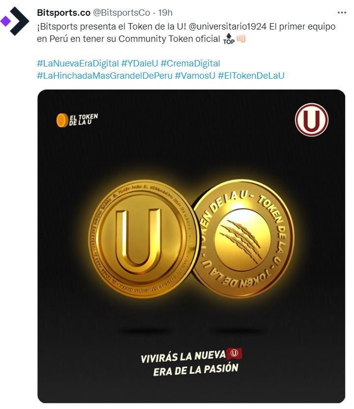 El equipo de fútbol profesional Club Universitario de Perú anunció “El Token de la U” como su criptomoneda oficial del club, los cuales ya se pueden reservar en el sitio web de Bitsports, una empresa colombiana enfocada en el fangagement, la cual se enfocada en fan tokens colaborativos.
