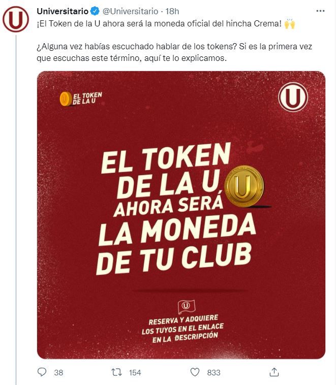 Sponsored“¡El Token de la U ahora será la moneda oficial del hincha Crema! ¿Alguna vez habías escuchado hablar de los tokens? Si es la primera vez que escuchas este término, aquí te lo explicamos. Ahora el Token de la U será la moneda del equipo de tus amores, con ella tendrás acceso a los beneficios de la nueva era de la pasión y sentir más cerca al equipo con más garra del Perú”.