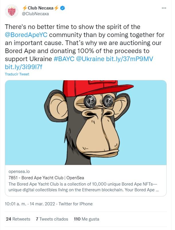 El club de fútbol Necaxa espera recaudar 300 mil dólares en la subasta de su NFT Bored Ape Yacht Club para donárselo a Ucrania en medio de la guerra con Rusia.