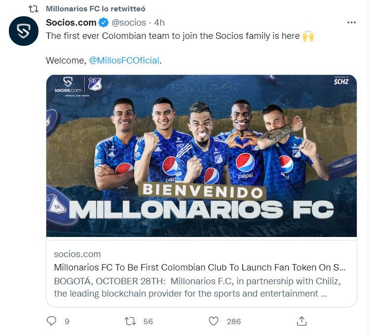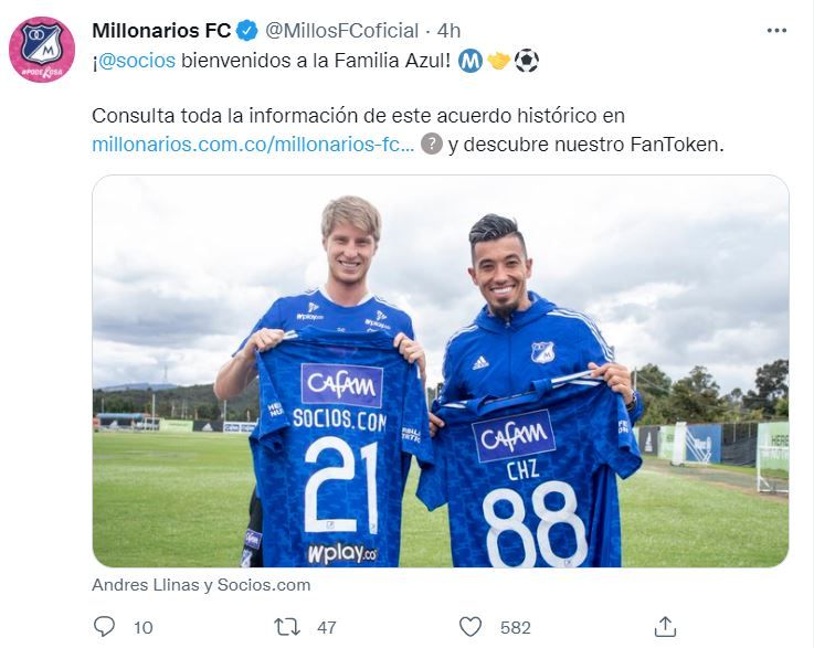 El Club Millonarios anunciaron una alianza con Chiliz (empresa matriz de Socios.com) para diseñar y lanzar su propio Fan Token $MFC, convirtiéndose en el primer equipo de fútbol colombiano en lanzar su token. Se suma a los clubes Barcelona, Manchester City, Paris Saint-Germain, Juventus, Inter de Milán, Arsenal, Atlético de Madrid, o las selecciones de Argentina o Portugal.