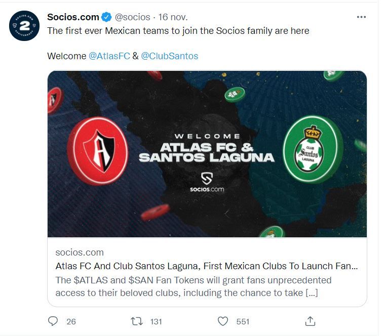 Socios.com entra oficialmente en México, a la Liga BBVA MX, y lanzará fan tokens de los clubes Santos Laguna y Atlas, los cuales no tienen fecha de lanzamiento, el número de tokens que se venderán y el precio, solo se saben los beneficios para los aficionados: experiencias VIP y acceso a artículos exclusivos. En tanto, Bitso anuncia la integración de Chiliz.
