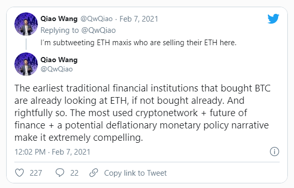 Wang comparte esta opinión e insiste en que es muy probable que Ehereum siga siendo una oferta.