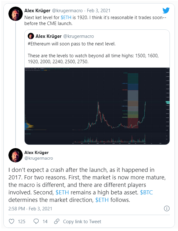 El aumento de Ethereum parece similar al espectacular rendimiento de Bitcoin. Algunos expertos confían en su potencial. El famoso trader y analista Alex Kruger rechazó la sugerencia de que ETH caería en picada y tuiteó: